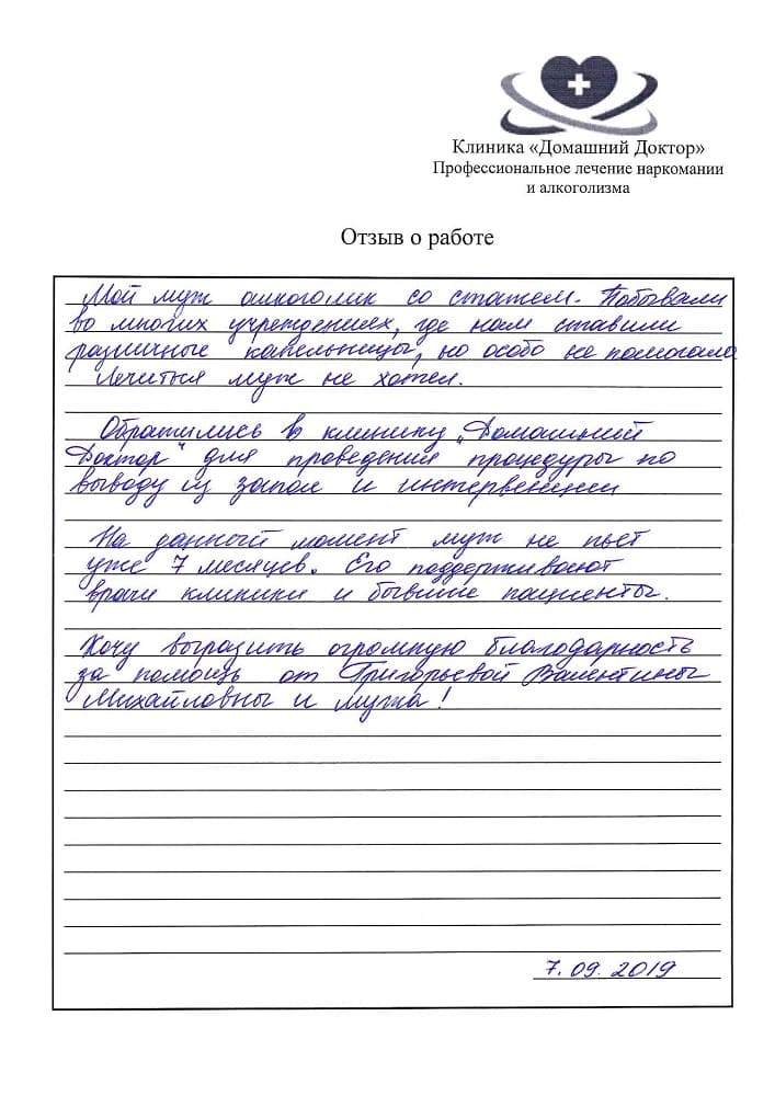 Когда муж прошел кодирование на 1 год, его состояние значительно улучшилось. Он стал трезвым, его жизнь изменилась к лучшему. Мы благодарны за этот метод лечения и за возможность жить без алкоголя.